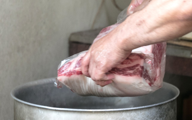 小さく切り分ける前に真空パックを行い数秒間だけ湯煎し熱を加えることによって旨味成分をぎゅっと肉の中へと閉じ込めます。